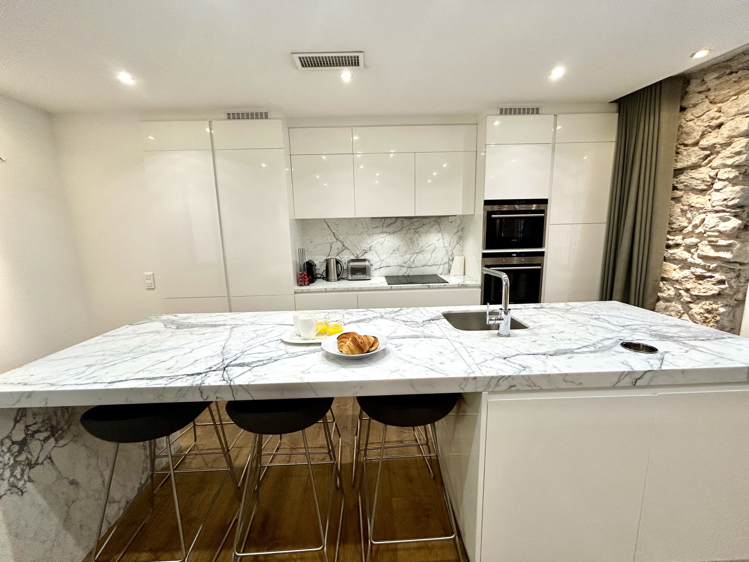The living area is enhanced by a superb open marble kitchen, ideal for sharing convivial moments around a meal or a drink. The apartment also includes a study space, perfect for working quietly if necessary.