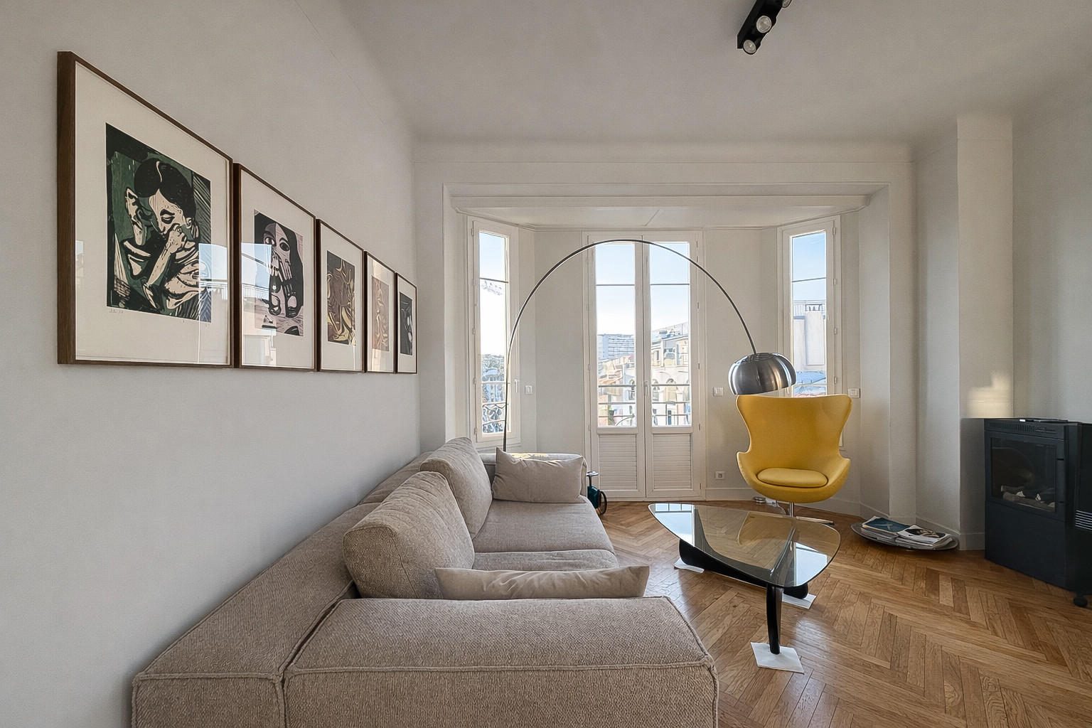 Perched on the 4th floor of a quiet building, the apartment opens onto a bright and spacious living room extended by a pleasant balcony. From this outdoor space, you enjoy an unobstructed view of the Forville Market, with a glimpse of the sea and the picturesque rooftops of Le Suquet. An ideal setting to savour a moment of relaxation after a day at the beach or a stroll through the city.