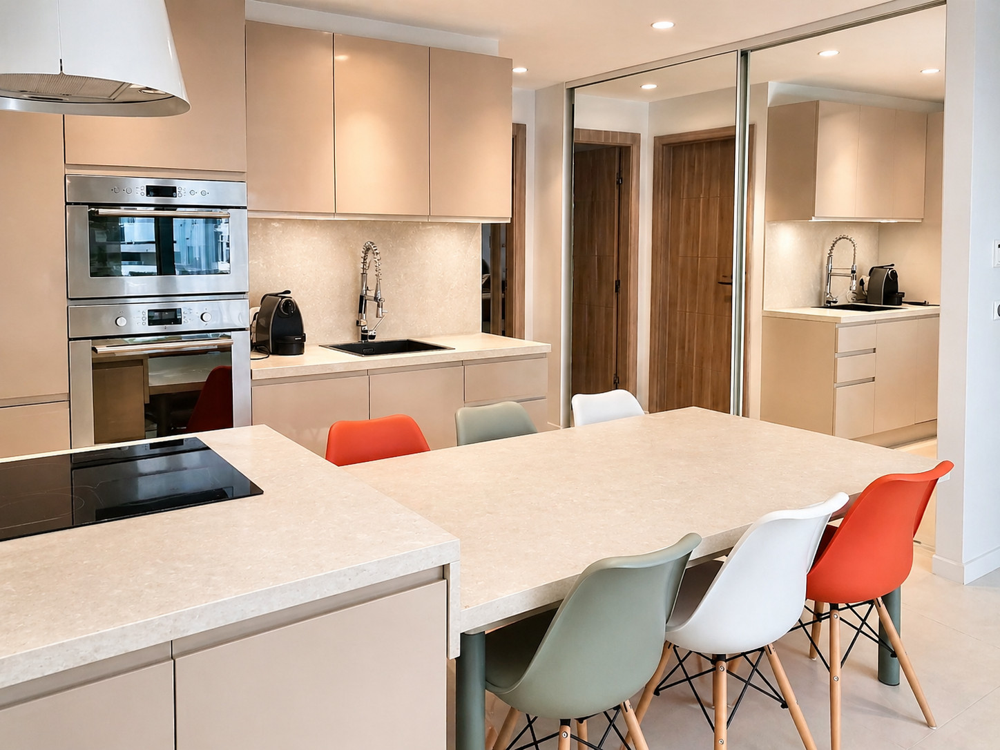 The apartment features two elegant bedrooms, a bathroom, and a superb master suite with its own private bathroom, ensuring comfort and privacy.