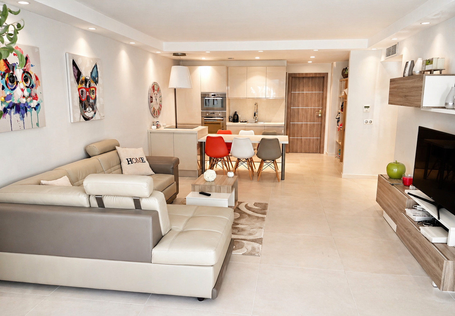 You will be seduced by its vast double living room bathed in light, opening onto a superb corner terrace, ideal for enjoying the soft Cannes evenings. The kitchen, fitted and fully equipped, integrates perfectly into the living space, combining conviviality and practicality.