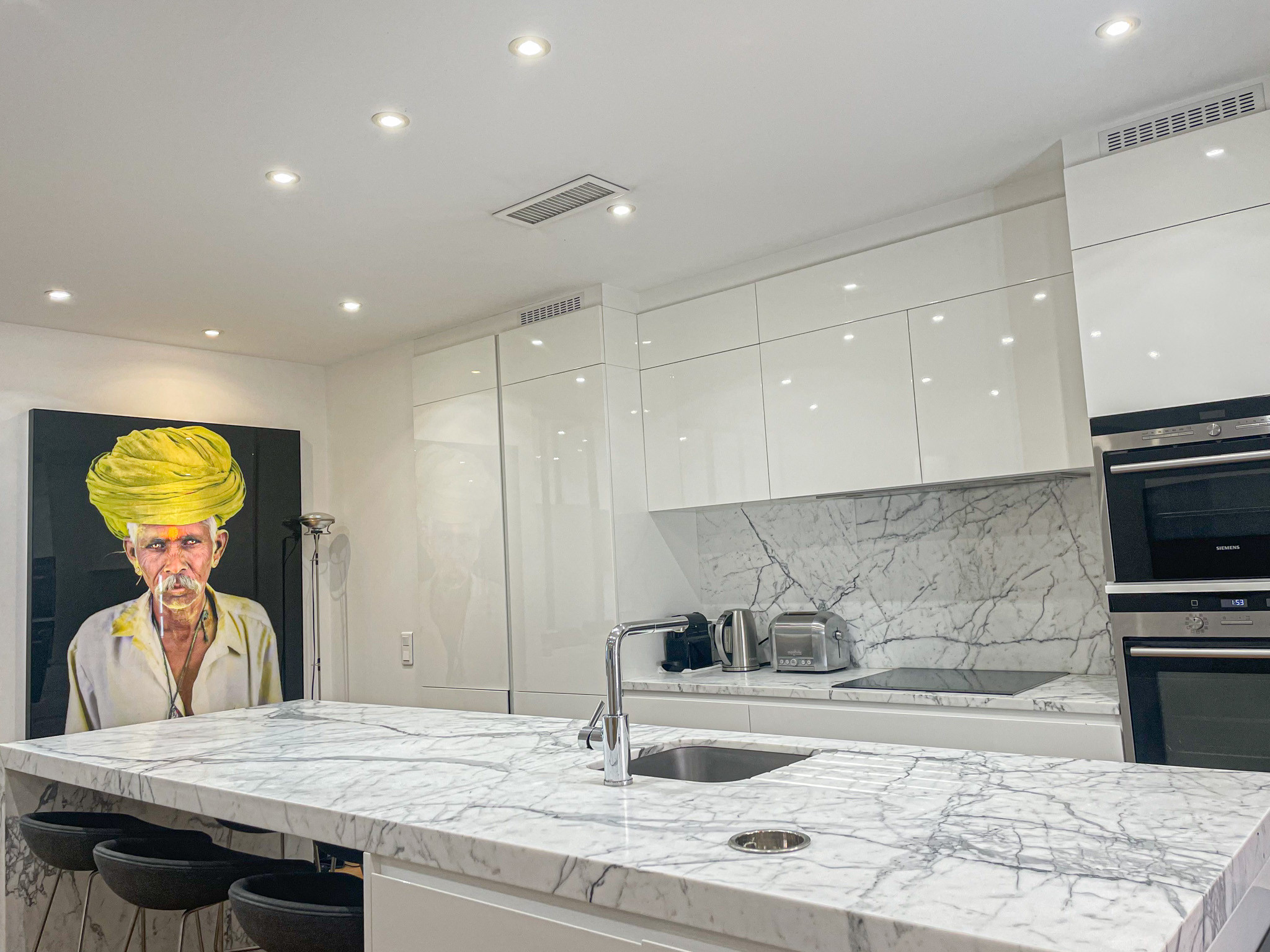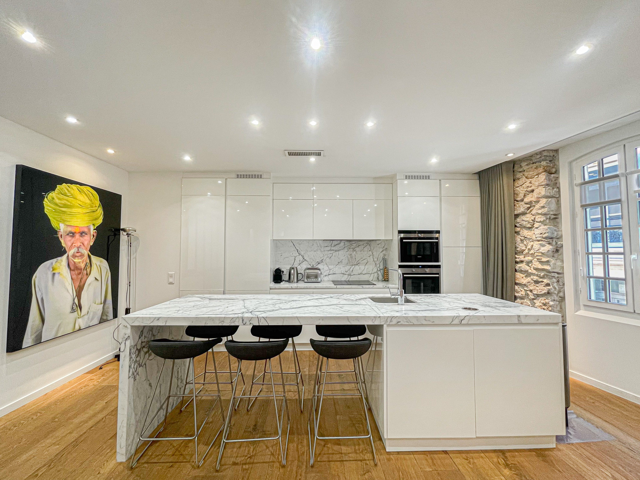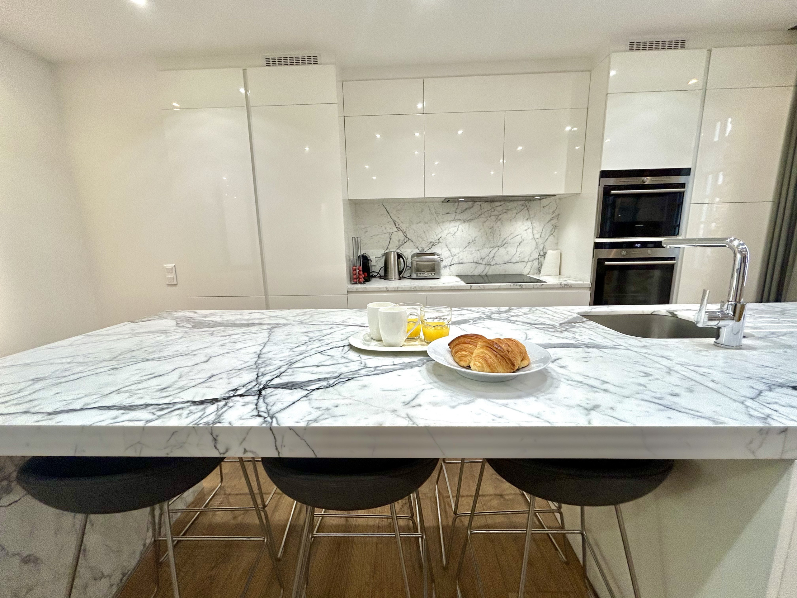 La pièce de vie est sublimée par une superbe cuisine ouverte en marbre, idéale pour partager des moments conviviaux autour d’un repas ou d’un verre. L’appartement comprend également un espace bureau, parfait pour travailler au calme si nécessaire.